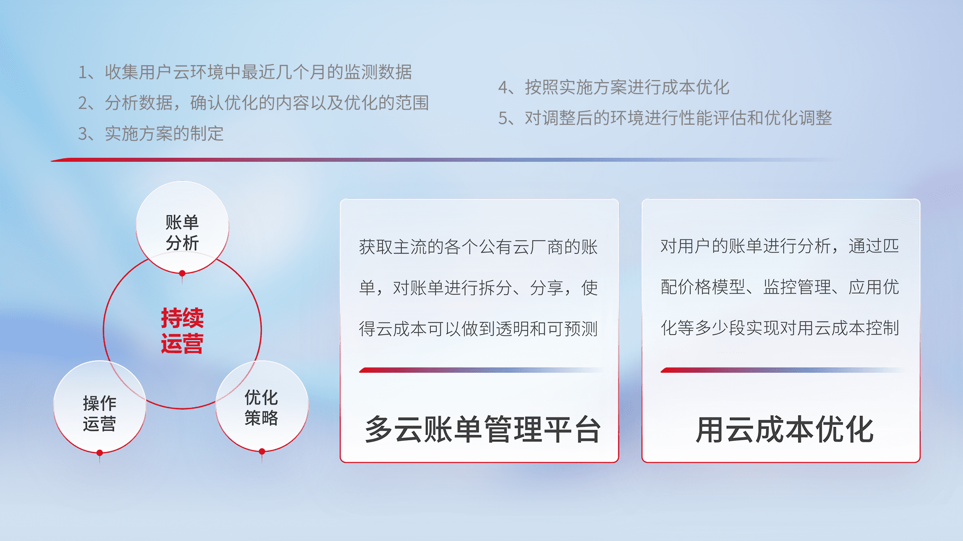 通过多云纳管,,,以统一的资源数据模型把客户的云资源进行抽象和封装,,进而实现对多云资源的统一操作,,,,保障云资源管理的可靠性、、、、稳定性与可用性。。量身定制化运维内容,,,,配置、、开发运维、、、、补丁管理、、、备份、、、、监控、、、、认证和访问管理、、审计和日常巡检等,,,,保障在用云过程中的可靠度,,,,稳定度以及高可用率。。。